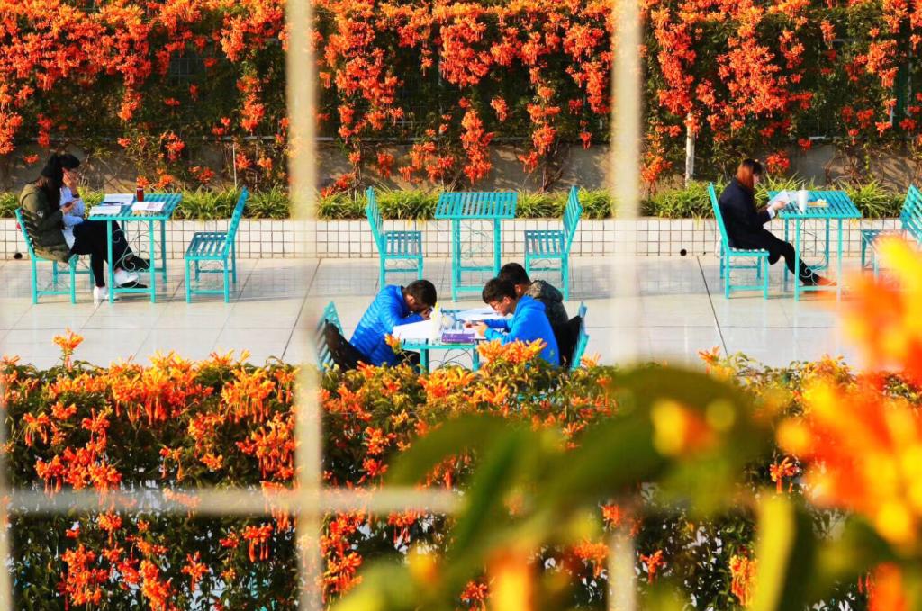 在后勤专人常年精心养护下,阳光室外阅读区藤蔓萦绕、鲜花灿烂、空气清新、视野开阔,阳光下一片一片娇艳盛开的鲜花、一墙一墙绿意盎然的藤蔓,与馆舍周围人工湖、草坪、植物、亭台以及馆舍中庭花木、室内罐装小植物等相得益彰,共同构建花园图书馆的自然之美和生态之美,尽显人与自然和谐共融的无限美好,使读者放松心情,缓解压力,安心、静心、舒心、养心。在这室外学习的理想之地,学生可以尽享阅读的美好,感受学习的魅力。