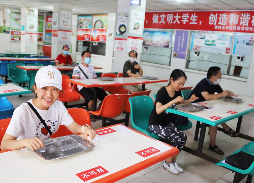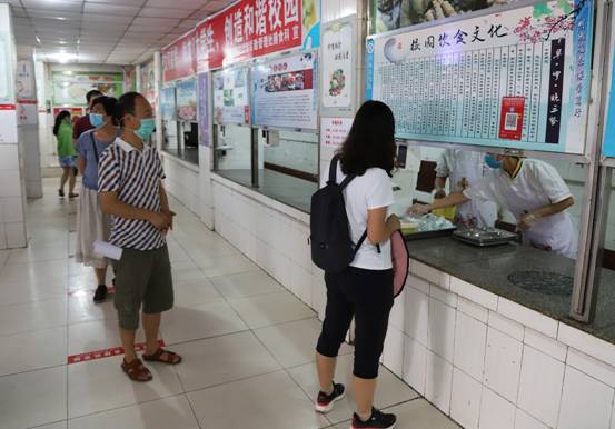 用餐前学生按“七步洗手法”清洁双手,按要求保持一米以上间距排队有序购餐后,或离开食堂就餐或在食堂按要求间隔就坐用餐。
