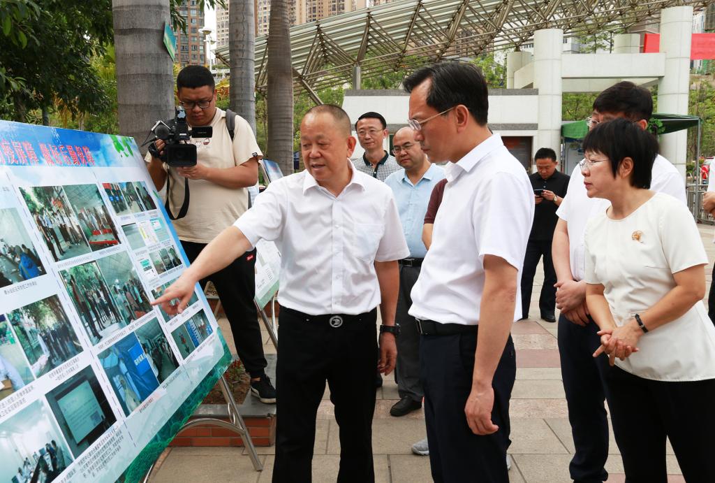 在来自钒钛学院、艺术学院、医学院和生化学院科研团队研发的产品展台前,李江听取了团队负责人对研发产品及相关技术、成果和应用前景的介绍。随后参观了学校办学成果的展示,肖立军和相关负责人介绍了学校党建和思政工作、纪检监察学院办学和康养学院办学等方面的成效和特色。