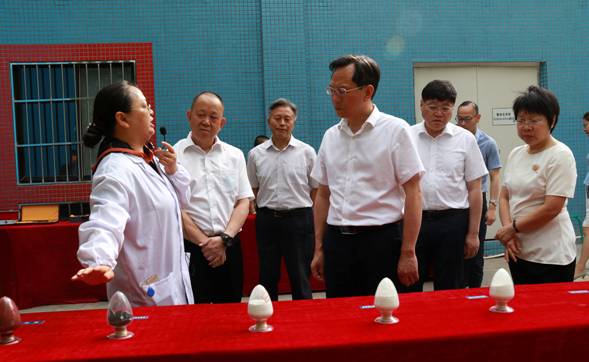 党委书记肖立军向李江厅长介绍实验室研制的钒钛产品