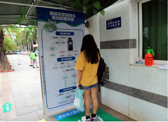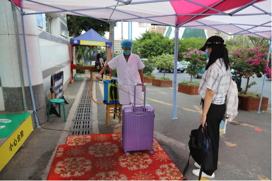 返校学生在工作人员和志愿者的指引下,依次通过行李消毒、体温检测和人脸识别等进校程序,无异常后方可进入校园。