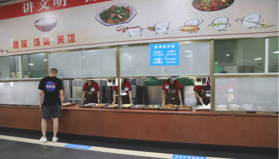 宿舍整理完毕,学子们来到久违的食堂,丰富多样的套餐满足同学们的不同需求。学生按照引导标识和间隔标识,有序排队购餐取餐。学校食堂实行错峰就餐,提供一次性餐具,提倡师生自带餐具。
