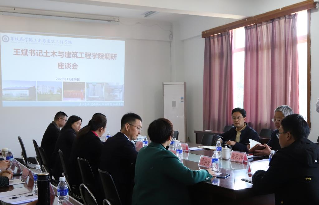 调研座谈会上,王斌听取了各学院关于党建工作、师资队伍建设、学科建设、科学研究、社会服务、教育教学、人才培养等方面的工作开展情况,着重了解了各个学院目前工作中存在的困难以及下一步工作计划和发展思路。就对外学术交流、翻译硕士点争取工作等在外国语学院与参会人员进行了交流;就技校办学、职业技能鉴定等在交通与汽车工程学院与参会人员进行了交流;王斌和省纪委监委驻攀枝花学院纪检监察组组长、党委副书记、纪委书记彭徐,就艺术学院教学三融合、志愿服务项目申报、提高横向科研经费、优秀校友事迹挖掘等在艺术学院与参会人员进行了交流;就搭建产教融合平台、土木水利专业学位硕士点申报等在土木与建筑工程学院与参会人员进行了交流;就经济与管理产教融合推进、招生就业等在经济与管理学院与参会人员进行了交流。