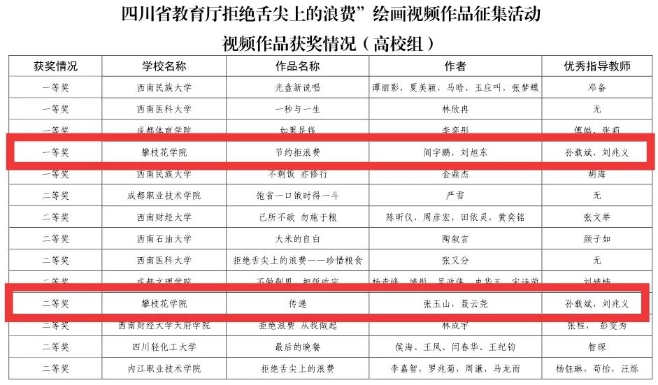 阎宇鹏、刘旭东同学视频作品《节约拒浪费》获高校组一等奖,张玉山、聂云尧同学视频作品《传递》获高校组二等奖,艺术学院孙载斌、刘兆义获优秀指导教师称号,我校荣获优秀组织奖。