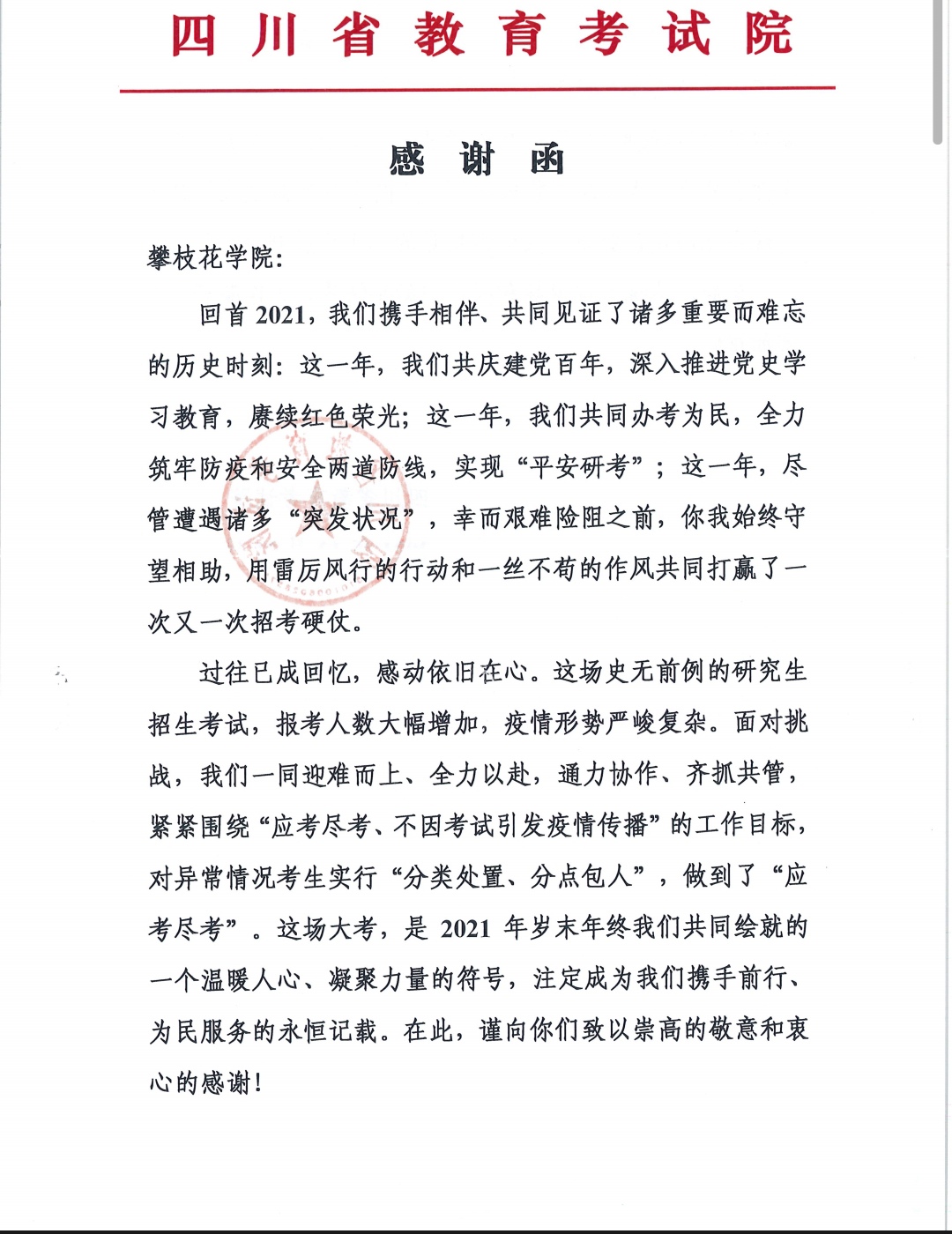 近日,我校收到一封来自四川省教育考试院的感谢信。信中高度赞扬了我校在2022年硕士研究生招生考试组织实施过程中所做的工作。并在新年之际,对校领导及老师们送上了美好祝愿。