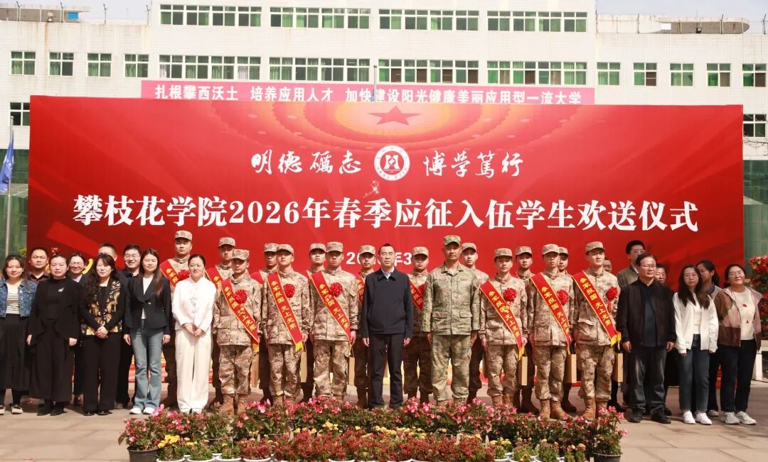 3月19日上午,我校在阳光广场举行2026年春季大学生应征入伍欢送仪式,热烈欢送15名优秀学子奔赴军营、报效祖国。党委常委、副校长张旭辉出席并讲话,攀枝花市东区人武部上校部长杨正学,各二级学院分管学生工作领导、辅导员和教师代表、学生代表、学生家长代表参加仪式。