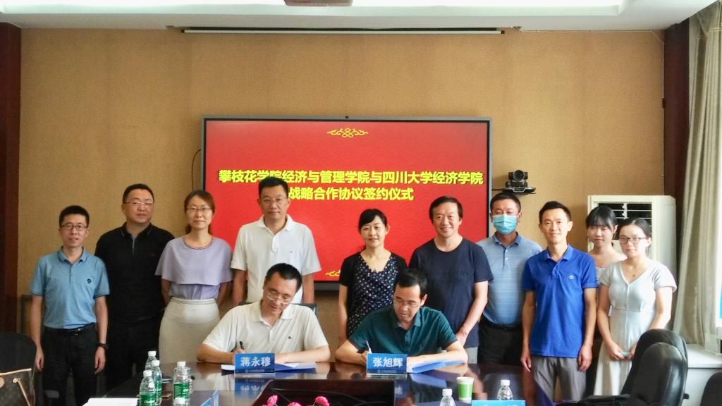 张旭辉、蒋永穆分别代表攀枝花学院经济与管理学院与四川大学经济学院签署了《四川大学经济学院—攀枝花学院经济与管理学院战略合作协议书》。