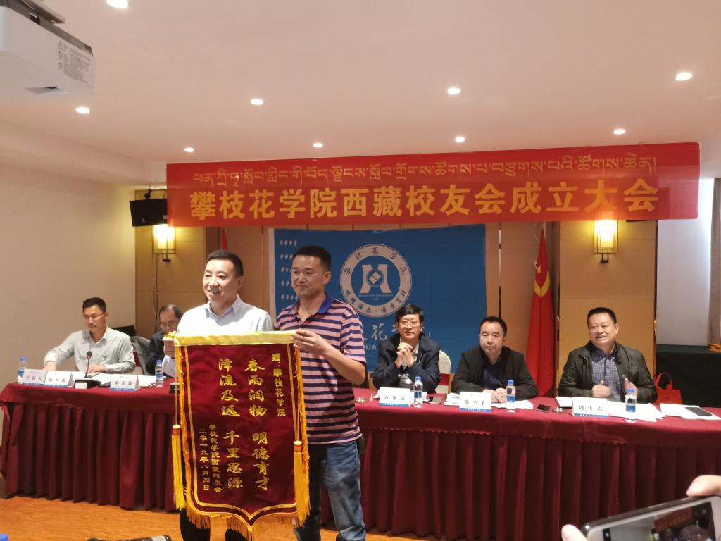 西藏校友会会长刘红军(右)向母校赠送锦旗