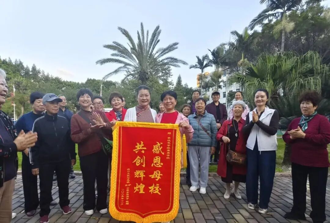 10月15日下午,作为此次返校行程的核心环节,校友们怀揣着对青春的眷恋和对母校的思念,抵达攀枝花学院,开启了一场意义非凡的母校探访之旅。校友们首先踏入校史馆,泛黄的老照片和珍贵的史料,勾勒出学校自创办以来的奋斗轨迹。驻足凝视之际,求学往事、课堂点滴如潮水般涌上心头,大家为母校42年来的跨越式发展深感自豪。随后,校友们在康养学院院长兰玛、基础医学院党委书记王鹃的陪同下,前往东华山校区——即现在的攀枝花市卫校所在地。这里有他们求学追梦的起点,校园内那棵1974年种植于河门口卫校的棕榈树,更是勾起了众人的青春记忆。大家围站在树下,共同回忆往昔的点点滴滴。在交流过程中,学院负责人向校友们介绍,自1998年卫校并入攀枝花大学后,医学院发展壮大,目前下辖基础医学院、康养学院`第一临床医学院(攀枝花学院附属医院)和第二临床医学院(攀枝花市中心医院)4个教学单位,实现了医教协同发展的育人模式。怀着深深的感恩之情,校友代表向基础医学院和康养学院赠送了一面写有“感恩母校 共创辉煌”的锦旗。那烫金的字样,不仅凝聚着校友对母校医学教育的高度认可,更承载着他们对后辈传承医道、勇担使命的殷切期望,传递出跨越半世纪的师生情谊与专业传承。