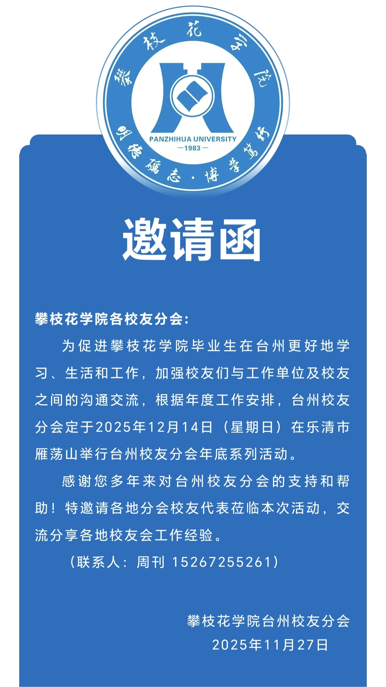 经攀枝花学院台州校友分会申请,攀枝花学院校友总会同意台州校友分会于2025年12月14日(星期日)在乐清市雁荡山举行台州校友分会年底系列活动,欢迎校友参加!