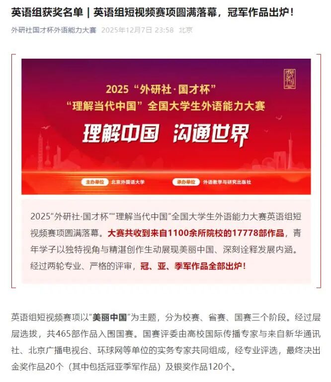 12月5日-8日,2025年“外研社·国才杯”“理解当代中国”全国大学生外语能力大赛全国总决赛在北京举行,我校外国语学院参赛团队(团队成员:祝定逸、高科、陈帆、胡安乔;指导教师:严艳、刘小宇、付乔)荣获全国总决赛英语组短视频赛项银奖。外国语学院与基础医学院组成的跨学院团队(团队成员:陶可怡、周欣平;指导教师:严艳、刘小宇、陈怡)荣获全国总决赛英语组短视频赛项铜奖。此次获奖实现我校学子在该项比赛全国总决赛中获奖零的突破。